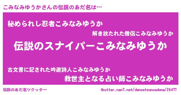 | 意味不明あだ名 | 『住所不定無職こみなみゆうか(98歳)』 |