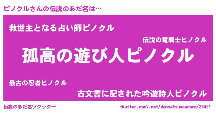 | 意味不明あだ名 | 『自称ピノクル』『なめこ科ピノクル属』 |