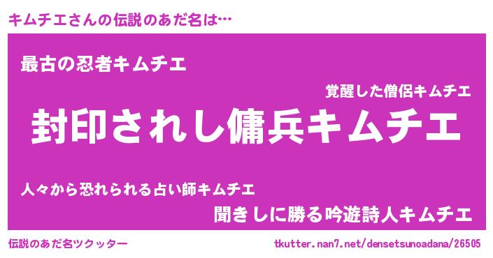 | 男性向けラノベタイトル風あだ名 | 『キムチエに滅ぼされるだけの簡単なお仕事です』 |