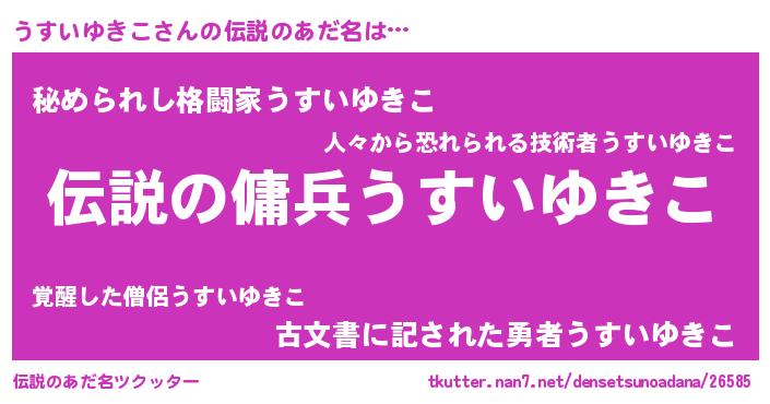 | 女子向けラノベタイトル風あだ名 | 『うすいゆきこが死なない童話 林檎のうすいゆきこの診療簿』 |