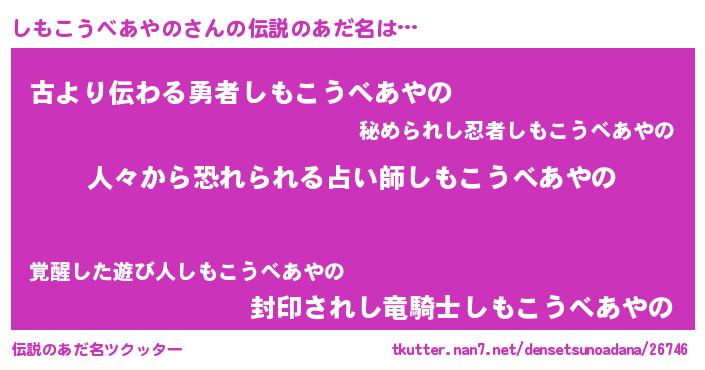 | ヘコむあだ名 | 『しもこうべあやの(爆)』『しもっふぃ~』 |