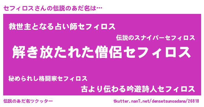 | 男性向けラノベタイトル風あだ名 | 『セフィロスの嫁は女の子じゃないと思った?』 |