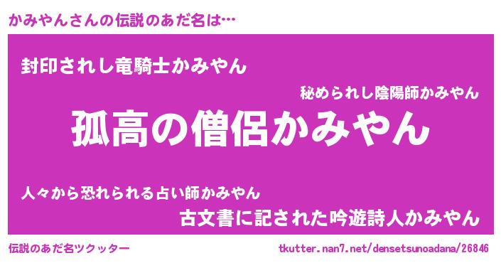 | 女子向けラノベタイトル風あだ名 | 『かみやんが死なない童話 林檎のかみやんの診療簿』 |