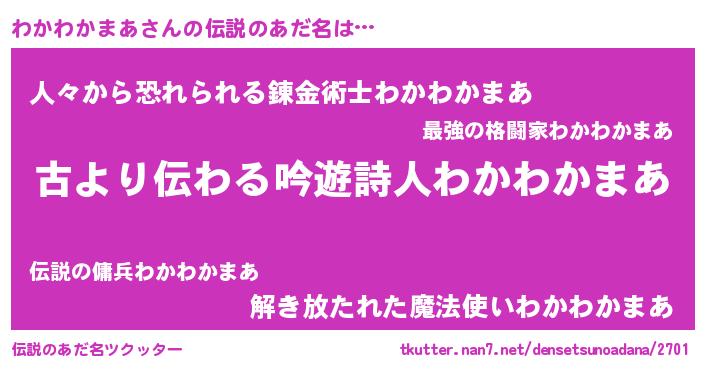 | ヒーロー風カッコイイあだ名 | 『ネオワカワカマア』『仮面ワカダー』 |