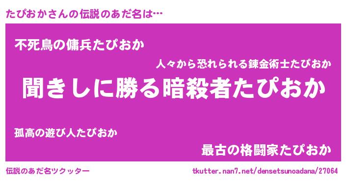 | 女子向けラノベタイトル風あだ名 | 『異世界で失敗しない100のたぴおか』 |