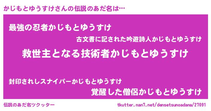 | 男性向けラノベタイトル風あだ名 | 『かじもとゆうすけ~年齢イコール彼女いない歴の魔法使い~』 |