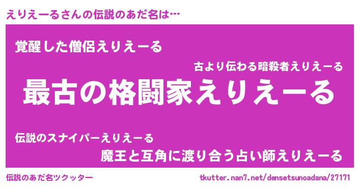 | 男性向けラノベタイトル風あだ名 | 『えりえーるに滅ぼされるだけの簡単なお仕事です』 |