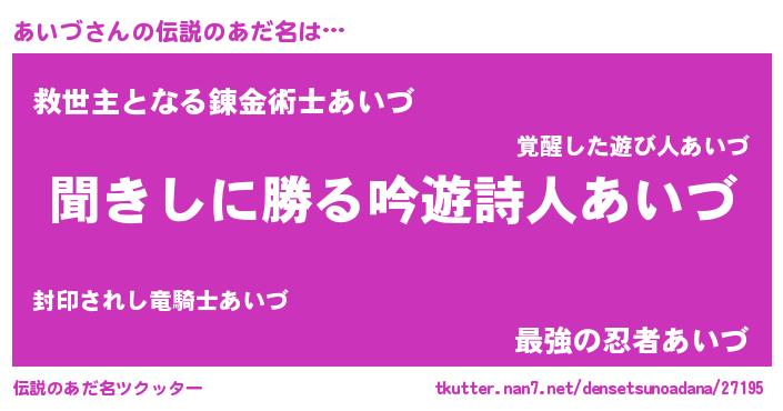 | ヒーロー風カッコイイあだ名 | 『ネオアイヅ』『天空の使者あいづ』 |