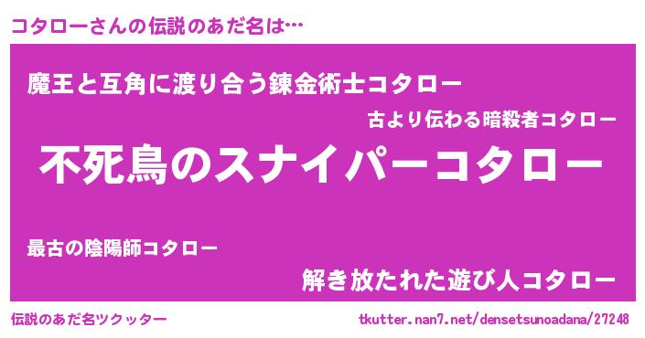 | ファンタジー風あだ名 | 『コタフェル』『ゼコタトゥ』 |