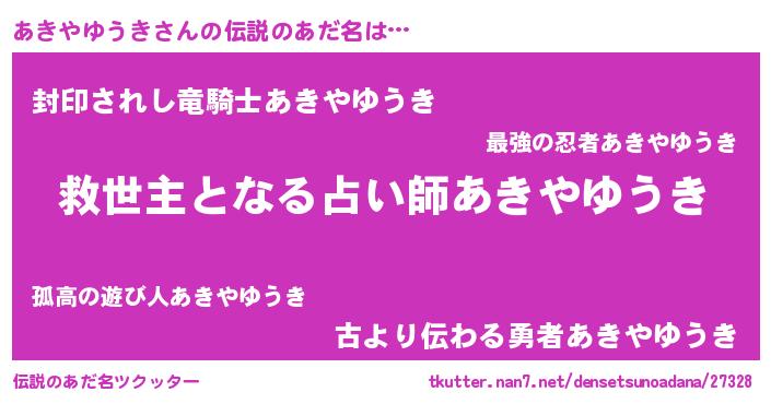 | 男性向けラノベタイトル風あだ名 | 『ノーゲーム・ノーアキヤユウキ』 |