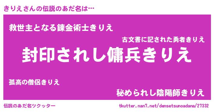 | 男性向けラノベタイトル風あだ名 | 『Re:きりえから始める異世界生活』 |