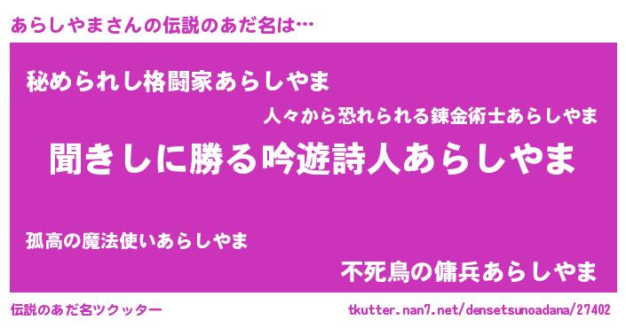 | 男性向けラノベタイトル風あだ名 | 『あらしやまという概念が存在しない退屈な世界 』 |