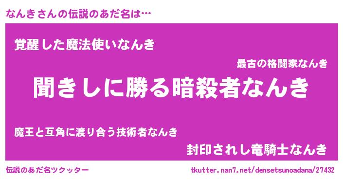 | 男性向けラノベタイトル風あだ名 | 『なんきという概念が存在しない退屈な世界 』 |