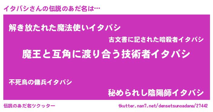 | ヒーロー風カッコイイあだ名 | 『慈愛の使者イタバシ』『幻影騎士イタ』 |