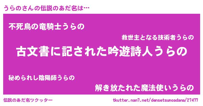 | 男性向けラノベタイトル風あだ名 | 『うらのに滅ぼされるだけの簡単なお仕事です』 |