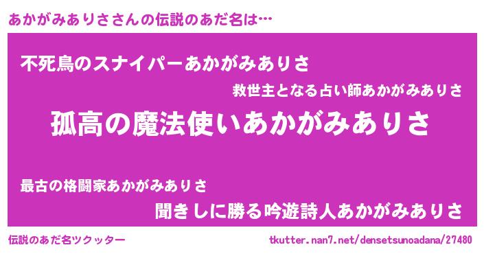 | 意味不明あだ名 | 『とにかく怪しいあかがみありさ』 |