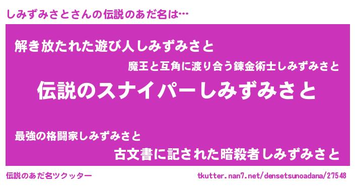 | 胡散臭い通販商品みたいなあだ名 | 『必ず成功する霊験あらたかなお札…その名も「しみずみさと」』 |