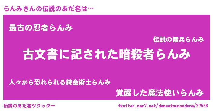 | 男性向けラノベタイトル風あだ名 | 『Re:らんみから始める異世界生活』 |