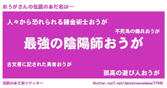 | 男性向けラノベタイトル風あだ名 | 『この素晴らしい世界におうがを!』 |