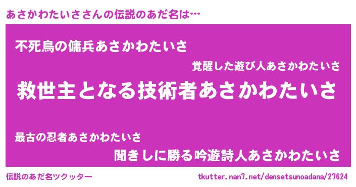 | 男性向けラノベタイトル風あだ名 | 『ノーゲーム・ノーアサカワタイサ』 |