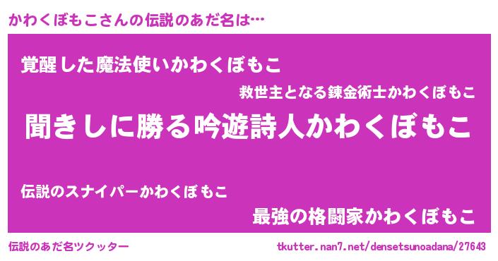 | 女子向けラノベタイトル風あだ名 | 『かわくぼもこなんてお断りですっ。』 |