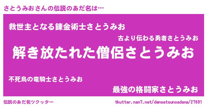 | ヒーロー風カッコイイあだ名 | 『魔戒騎士サト』『愛の使者さとうみお』 |