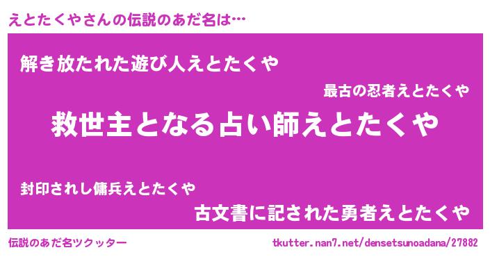 | ヒーロー風カッコイイあだ名 | 『究極戦士エトタクヤ』『天弓騎士エト』 |