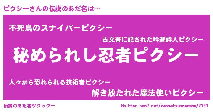| ヒーロー風カッコイイあだ名 | 『ウルトラ戦士ピクシー』『暗黒騎士ピク』 |