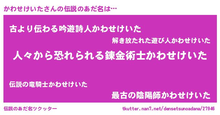 | 女子向けラノベタイトル風あだ名 | 『かわせけいたアンティーク』 |