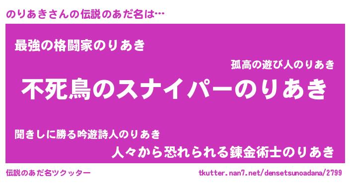 | 男性向けラノベタイトル風あだ名 | 『Re:のりあきから始める異世界生活』 |