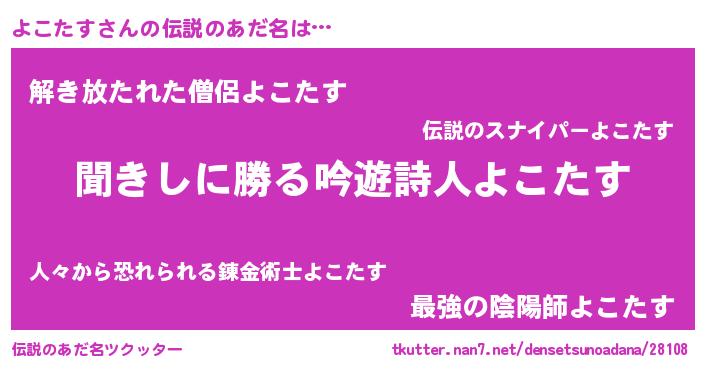| 男性向けラノベタイトル風あだ名 | 『よこたすという概念が存在しない退屈な世界 』 |