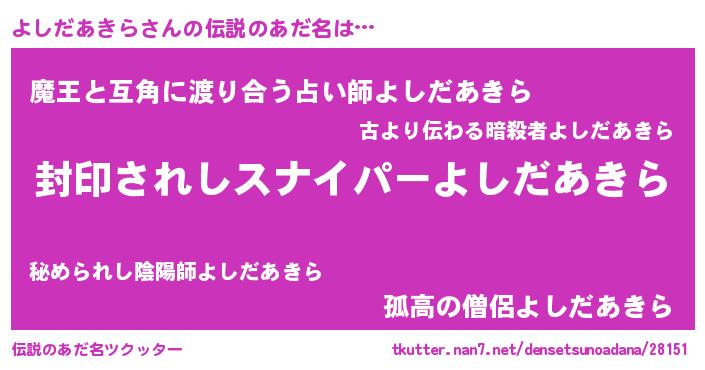 | 胡散臭い通販商品みたいなあだ名 | 『億万長者になれる霊験あらたかなお札…その名も「よしだあきら」』 |
