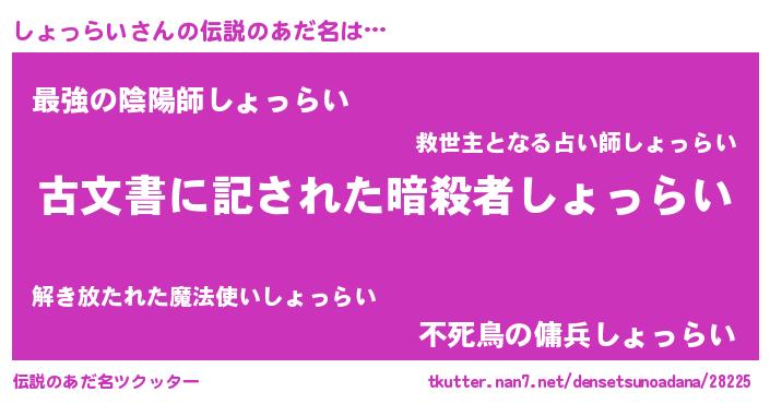 | 男性向けラノベタイトル風あだ名 | 『Re:しょっらいから始める異世界生活』 |