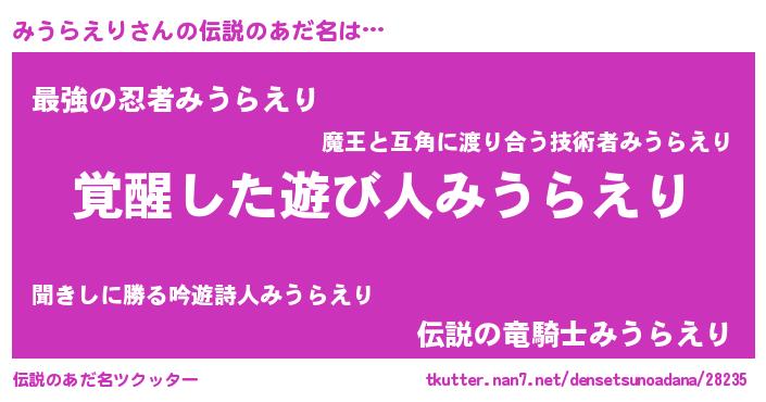 | 男性向けラノベタイトル風あだ名 | 『みうらえりの嫁は女の子じゃないと思った?』 |