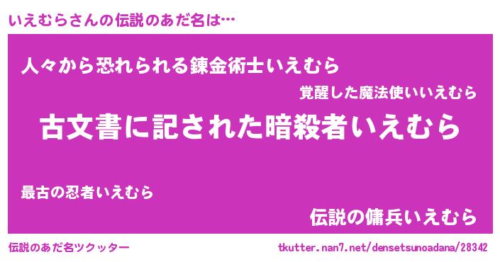 | 男性向けラノベタイトル風あだ名 | 『いえむらに滅ぼされるだけの簡単なお仕事です』 |