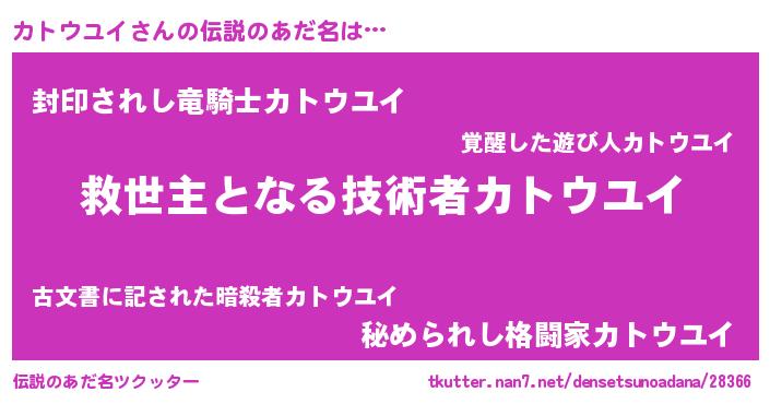 | 男性向けラノベタイトル風あだ名 | 『この素晴らしい世界にカトウユイを!』 |