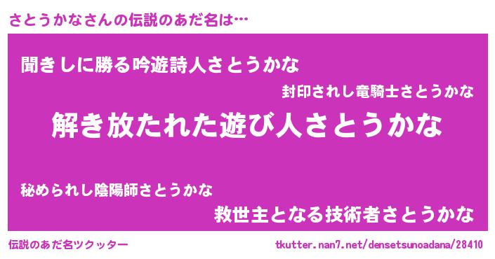 | 男性向けラノベタイトル風あだ名 | 『さとうかなの嫁は女の子じゃないと思った?』 |