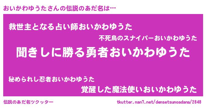 | 男性向けラノベタイトル風あだ名 | 『オイカワユウタスレイヤー』 |