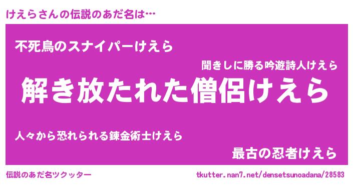 | ヒーロー風カッコイイあだ名 | 『銀牙騎士ケエ』『スーパーケエラ』 |