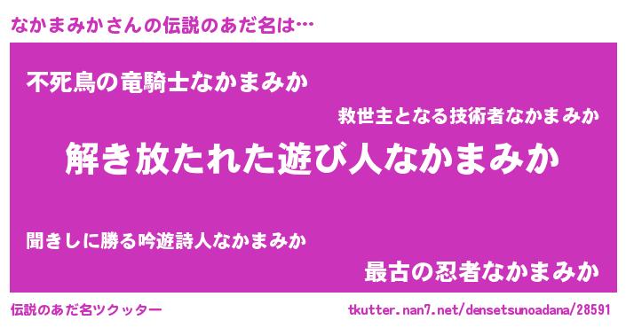 | 男性向けラノベタイトル風あだ名 | 『転生したらなかまみかだった件』 |