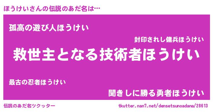 | 男性向けラノベタイトル風あだ名 | 『Re:ほうけいから始める異世界生活』 |