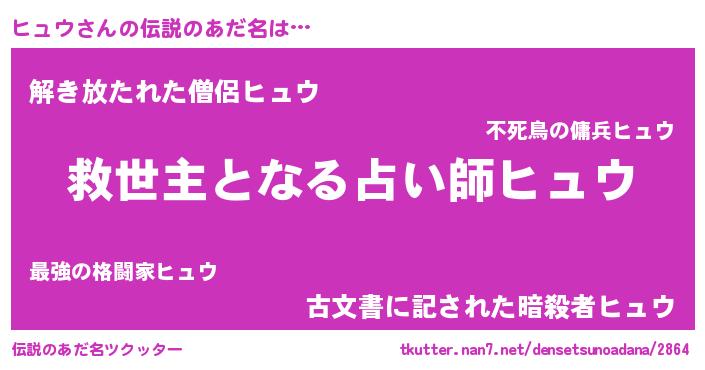 | 男性向けラノベタイトル風あだ名 | 『うちのヒュウが世界を掌握している!』 |