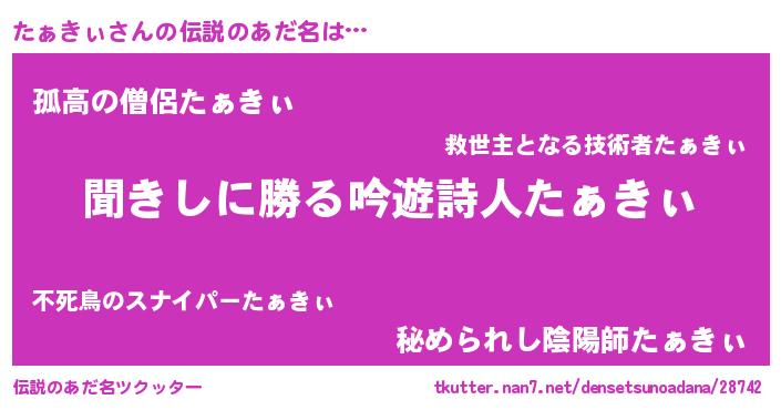 | 男性向けラノベタイトル風あだ名 | 『たぁきぃという概念が存在しない退屈な世界 』 |