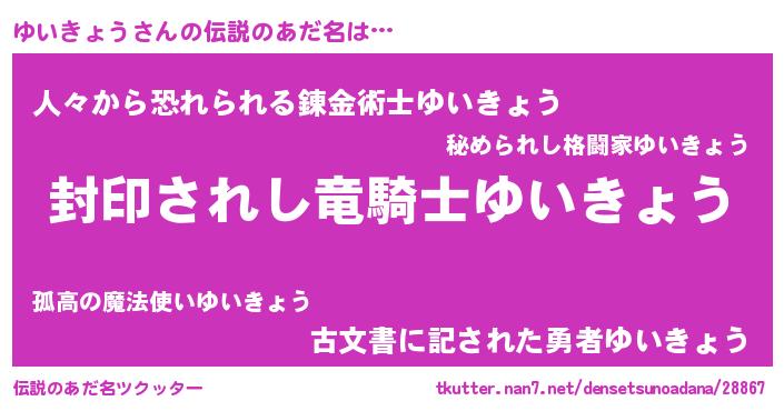 | 男性向けラノベタイトル風あだ名 | 『ゆいきょう~年齢イコール彼女いない歴の魔法使い~』 |