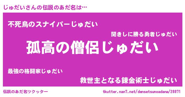 | 男性向けラノベタイトル風あだ名 | 『ダンジョンにじゅだいを求めるのは間違っているだろうか』 |