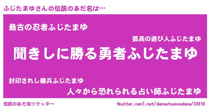 | 男性向けラノベタイトル風あだ名 | 『魔弾の王とふじたまゆ』 |