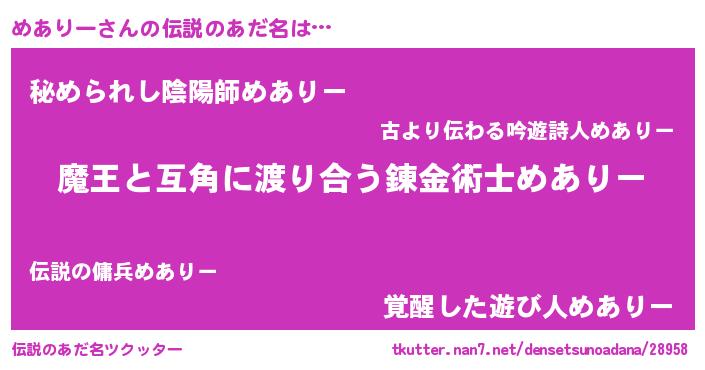 | 胡散臭い通販商品みたいなあだ名 | 『世界中を虜にした世界で10本だけ現存している希少なブランデー…その名も「めありー」』 |