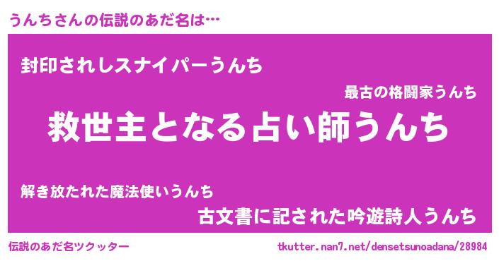 | 男性向けラノベタイトル風あだ名 | 『うんち~年齢イコール彼女いない歴の魔法使い~』 |