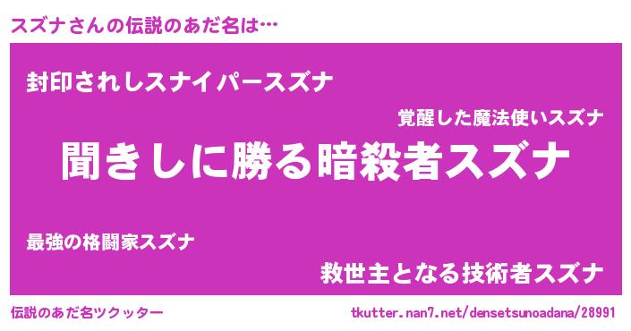 | 女子向けラノベタイトル風あだ名 | 『異世界で失敗しない100のスズナ』 |