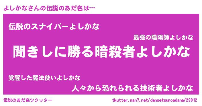 | 男性向けラノベタイトル風あだ名 | 『魔弾の王とよしかな』『よしかなの憂鬱』 |